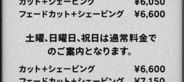 10月〜料金のご案内です 平日お得10:00〜20:00 カット+シェービング ¥6,050 フェードカット+シェービング ¥6,600 土曜、日曜日、祝日は通常料金でのご案内となります。 カット+シェービン … 続きを読む 10月〜料金のご案内